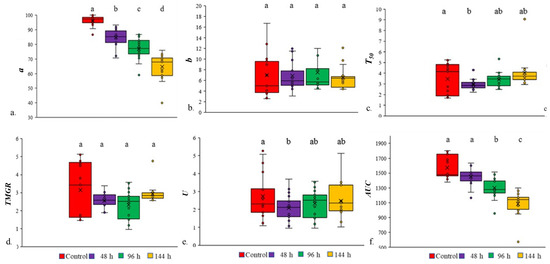 Boxplot showing the response of 4-PHF parameters in unaged and aged onion varieties. Mean values of each treatment were separated by performing Tukey’s HSD pair-wise test with p ≤ 0.05. Letters above each box plot indicate significantly different groups (a) germination capacity (a), (b) shape and steepness of germination curve (b), (c) time to 50% germination (T50), (d) time to maximum germination rate (TMGR), (e) Uniformity (U) and (f) area under curve (AUC).
