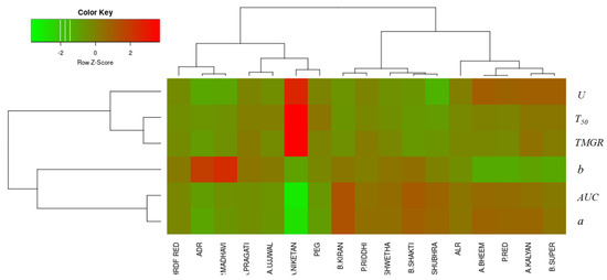 Heat map generated from 4−PHF (a, b, T50, TMGR, U and AUC) for clustering the 144 h−aged varieties. The data were subsetted per treatment, with columns representing the values of individual samples and rows representing selected parameters (a, b, T50, TMGR, U and AUC). Red and green represent high and low parameter values, respectively. The values of individual samples were normalized per parameter using z−Fisher transformation.