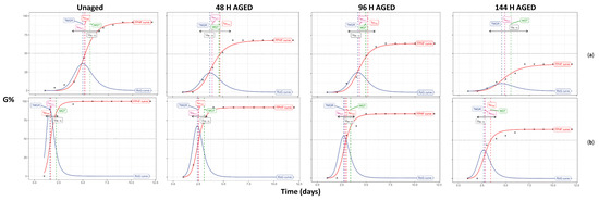The TMGR did not significantly differ between the unaged and aged varieties. It ranged from 1.46–5.12, 1.88–3.37 and 0.95–3.56 days in the unaged, 48 and 96 h-aged varieties, respectively. Upon extending ageing to 144 h, the TMGR shifted from 2.55 to 3.14 days (Figure 1d).