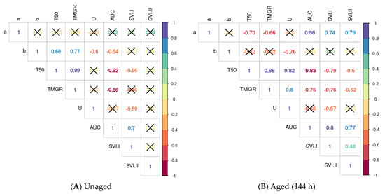 Pearson correlation coefficients between selected parameters for (A) unaged and (B) 144 h−aged seeds. The colour of the number reflects the strength of the correlation. The non-significant correlations, with p−values above 0.05, are indicated with X in the individual cells.