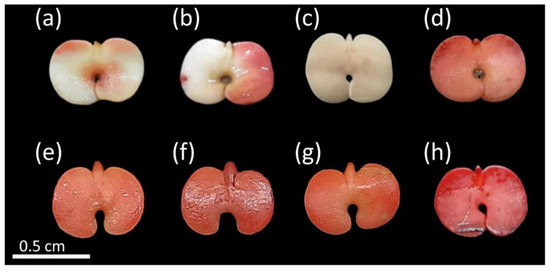 By using the TZT, it was possible to determine the classes of the viable (Figure 2) and non-viable seeds (Figure 3). The viable seeds had nearly uniform crimson-red color and turgid tissues (Figure 2). Some superficial damages were observed, mainly at the edges of the cotyledons, but this did not affect the viability of these seeds (Figure 2k–n). These damages might have been caused during seed harvest, processing, or tegument removal [44].