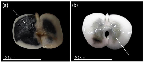 Formation of dark spots in seeds of Handroanthus spongiosus (Rizzini) S. Grose (Bignoniaceae) after soaking for 18 h in distilled water. (a,b) dark spots after soaking in distilled water for 18 h.