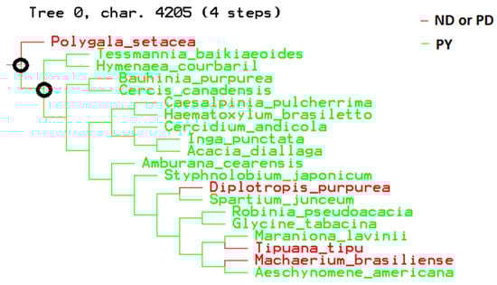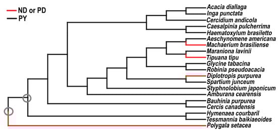 Ribulose-1, 5-biphosphate carboxylate/oxygenase large subunit (rbcL), and maturase K (matK) chloroplast gene sequences for taxa with fossil records were drawn from GenBank, as these gene sequences have previously been used to investigate phylogenetic relationships among Fabaceae with fossil records (Supplementary Table S1, [28,36]). Sequences were aligned using Muscle v. 3.8.31 [37] and subsequently manually checked for alignment. Genbank-to-Tree Analysis Using New Technology [38,39] was used to create FASTA files, which were dually uploaded in Bayesian Evolutionary Analysis Utility (BEAUTi) and Bayesian Evolutionary Analysis Sampling Trees (BEAST), v. 2.6.5 [40] and TNT v. 1.5 [39]. As divergence time estimates for major clades in the Fabaceae are well constrained by previous investigations [26,28,36,41], this investigation did not incorporate these priors into phylogenetic reconstruction and divergence time estimation. Markov chain Monte Carlo (MCMC) chain length was set at 20,000,000 (10% burn-in) based on Tracer v. 1.7.2 [42] results. The program Tree Annotator [42] was used to create a maximum clade credibility tree, with burn-in and posterior probability established from analyzing the results of Tracer v. 1.7.2. PY and ND or PD were mapped to terminal taxa in the maximum clade credibility tree by creating a separate character matrix and reconstructing ancestral states using parsimony in Mesquite v. 3.61 [43]. Phylogenetic analysis also was performed using TNT, and PY and ND or PD were subsequently mapped to the molecular phylogeny by appending an additional character to the molecular dataset. Taxa with fossil records known to exhibit ND (water-permeable) seeds include Polygalaceae, Diplotropis, Machaerium, and Tipuana [1,44]. PY has been well demonstrated in the other lineages [1,45,46,47].