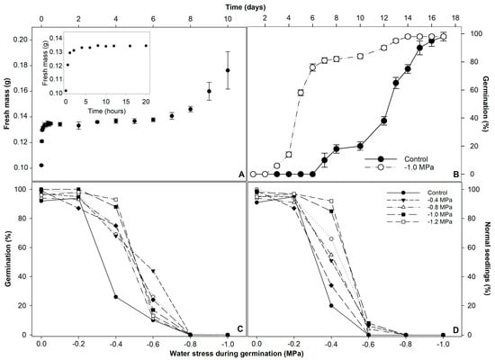 (A) Imbibition curve of Solanum paniculatum seeds showing phases I, II and III of water uptake. Points are the average of three replicates of 0.1 g each and bars represent standard deviation. The inset shows the faster uptake of water by the dry seeds during phase I. (B) Germination of S. paniculatum seeds submitted to osmopriming treatment (−1.0 MPa) and the control group (unprimed). (C) Germination percentage under water stress of Solanum paniculatum control and osmoprimed (−0.4, −0.8, −1.0 and −1.2 MPa) seeds. (D) Normal seedling percentage under water stress of Solanum paniculatum control and osmoprimed (−0.4, −0.8, −1.0 and −1.2 MPa) seeds. In (B–D) symbols represent the average of 4 replicates of 25 seeds each. All seeds were incubated in a germination chamber settled at 25 °C and a 12 h photoperiod.