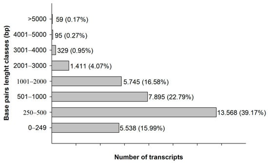 For the cDNA libraries derived from osmoprimed and control seeds, 19,779,709 and 15,773,140 single-end reads, respectively, were generated. After the cleaning and removal of low-quality reads (phred scores < 20), 19,468,919 and 15,534,731 clean reads were identified, respectively, derived from osmoprimed and control seeds. Based on the high-quality reads, 34,640 contigs were assembled with sizes ranging from 249 to 5000 base pairs that were grouped into eight classes based on the number of base pairs (Figure 2). The largest class was the one with fragment lengths of 250–500 bp (39.1%).