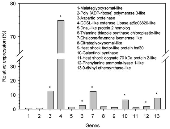 RT-qPCR validation of a specific group of genes that showed differential expression between water-deprived osmoprimed and unprimed Solanum paniculatum seeds in RNAseq. * Genes showed a differential expression in osmoprimed seeds (p < 0.05).