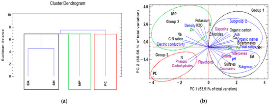 Hierarchical clustering and principal components analysis (PCA) used to understand treatment-variable relationships in the different seaweed liquid extracts from Eisenia arborea (EA), Macrocystis pyrifera (MP), Padina caulescens (PC), and Sargassum horridum (SH). (a) The mean values of different parameters were clustered in three groups, group 1 was the highlighted outline in black, group 2 (green), and group 3 (red), and (b) all data were analyzed via a principal component analysis (PCA). The lines originating from the central point of the biplots indicate positive or negative correlations of different variables; their closeness indicates the correlation strength with a particular treatment. The variables include characteristics physic (in blue) characteristic chemical (green and black) and secondary metabolites (purple) and the type of seaweed extract (abbreviations of capital letters in black) at 1.0% concentration.