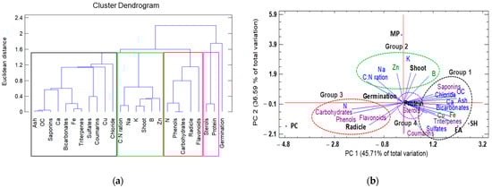 A second dendrogram classification was based on the physicochemical composition and presence of secondary metabolites in the seaweed extracts, in addition to germination, shoot length, radicle length, and protein content. This dendrogram resulted in the formation of four groups at a Euclidian distance of 1.5 (Figure 3a).