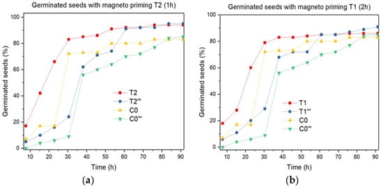 Figure 3 shows the germination percentage of seeds that were pre-treated with a magnetic field generated by a Helmholtz coil array: (a) T1 for 2 h and (b) T2 for 1 h. When comparing the seeds treated with magnetic field and the control samples, there were significant statistical differences. In relation to the comparison of the magnetic treatment T1 and the control seeds (C0: irrigated with distilled water), it can be observed that from the time of 7.5 h, the tendency of improvement in the quantity of germinated seed of the seed treated with magnetic field began, with the maximum difference existing at 22.8 h. After that, the test established a percentage difference of 43%. Similarly, the seed treated with magnetic field showed improvement when compared to the control seed (both treated with wastewater water); in this case, the maximum percentage difference (20%) between both seed conditions was presented 30 h after the germination test was established. It should be noted that seed germination is affected by the type of irrigation used. In this research, the amount of germinated seed was found to be more greatly affected in the samples that were treated with reclaimed water (Figure 3a).