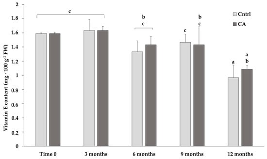 Content of vitamin E in chickpeas stored under standard (Cntrl) and controlled N2 atmosphere (CA). The bar-chart shows the means of 3 independent biological replicates (expressed as mg/100 g of fresh weight-FW) ± standard deviation (SD). Different letters indicate statistically significant differences (p ≤ 0.05) among the groups calculated with a one-way ANOVA followed by Tukey’s post hoc test. If a letter is shared, then the difference is not significant.