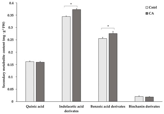 Content of the most abundant secondary metabolites in chickpeas stored for 12 months under standard (Cntrl) and controlled N2 atmosphere (CA) conditions. The bar-chart shows the means of 3 independent biological replicates (expressed as mg/g FW) ± standard deviation (SD). Asterisks denote statistically significant values (p < 0.05) in Student’s t-test.