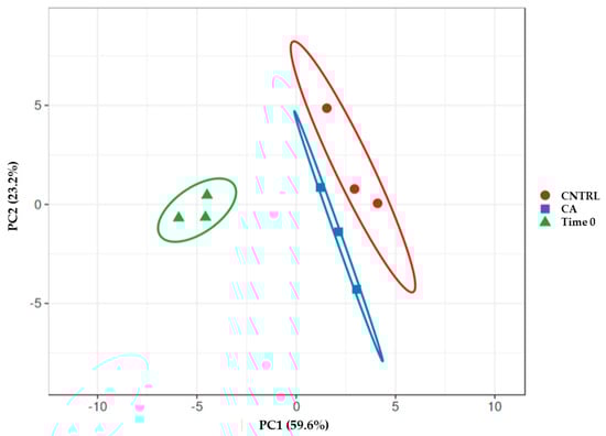 Statistics was performed with IBM SPSS statistics v26 (IBM SPSS, Chicago, IL, USA) on log10-transformed data. Normality and homogeneity were checked with a Shapiro–Wilk and Levene’s test. A univariate analysis with a Tukey’s post hoc test or an independent-samples t-test was conducted for homogeneous data following normal distribution. Otherwise, a non-parametric test for independent samples was carried out with a Kruskal–Wallis and Dunn’s post hoc test. The principal component analysis—PCA—was obtained with ClustVis [] (https://biit.cs.ut.ee/clustvis/ accessed on 1 October 2023).