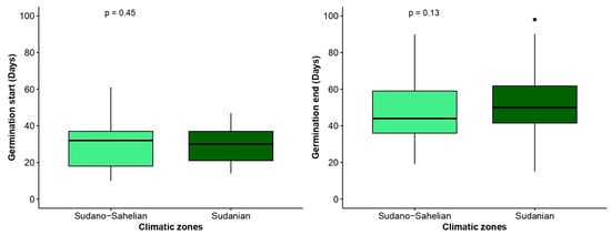 A one-way ANOVA was then applied to test the differences between the treatments and sites. Box plots were generated to visualize and explore variations in seed germination across climatic zones and collection sites. All the analyses were realized at a 5% level of significance and performed with the R statistical software package, version 4.2.1.