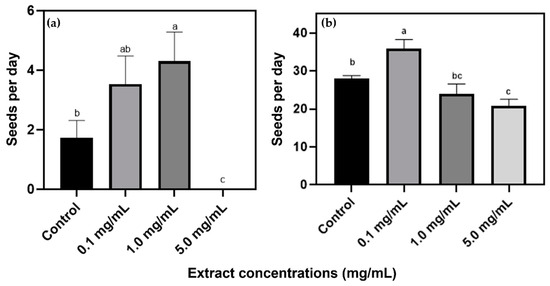 3.2. Effects of L. camara Extracts on S. viridis Germination and Initial Growth