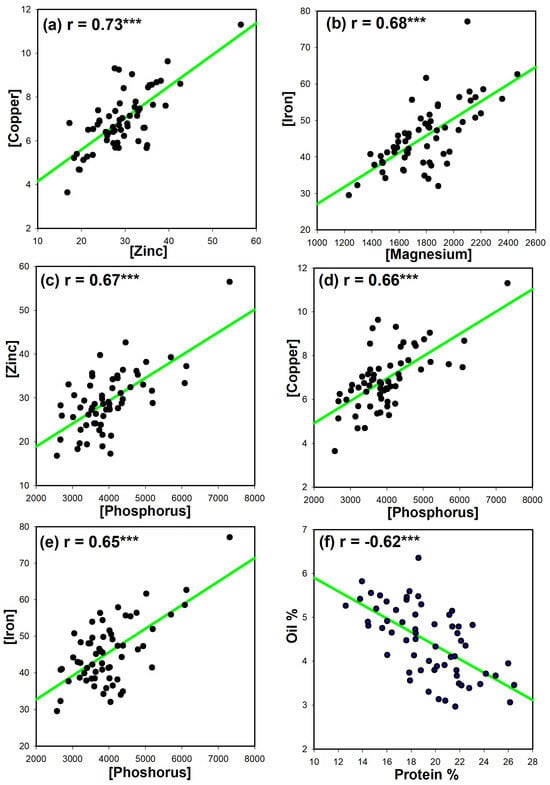 There was a strong positive relationship between Zn and Cu (r = 0.73, Figure 1a). There was a moderate positive relationship between Mg and Fe (r = 0.68, Figure 1b), P and Zn (r = 0.67, Figure 1c), P and Cu (r = 0.66, Figure 1d), and P and Fe (r = 0.65, Figure 1e). There was a negative relationship between protein and oil content (r = −0.62, Figure 1f).