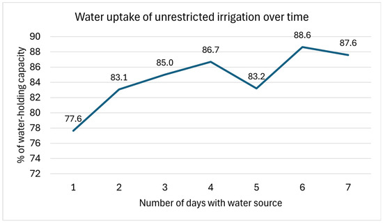 The unrestricted irrigation regime consisted of each pot having a wick cord connecting the soil to a DI water source below. The DI water was transported via a wick from a plastic tray that held the water to the top of the soil and, thus, was imbibed by the seed. Each pot had an individual tray to hold the DI water, and a wire rack separated the pot and the water tray to ensure the soil did not become saturated, thus creating anaerobic conditions and preventing seed germination. Preliminary tests were carried out to determine the rate of water uptake by the wick that was connected to the soil and were repeated three times. The full apparatus (pot, soil, and wick) was weighed each day and subtracted from the soil dry weight, wick, and pot weight in order to calculate the weight of the water in the soil. The percentage of the water-holding capacity was then calculated for each day (Figure 2). We found by weighing the pots each day that the soil water content increased up to day six, when it stabilized at 86–88% of the water-holding capacity. This allowed for a controlled irrigation regime to be applied. The results of this pre-experiment test are presented below (Figure 2).