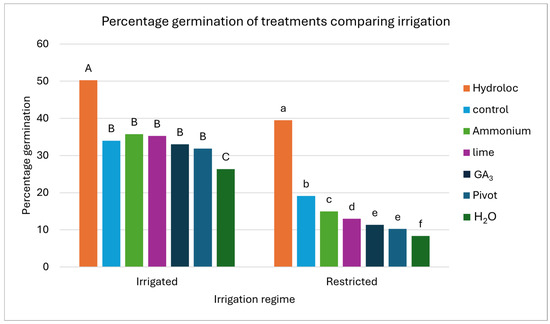 The percentage seed germination for each treatment under two irrigation regimes. The percentage germination of the 50 seeds planted after 21 days (Y-axis) and the irrigation regime (X-axis) are represented in the graph. The treatments applied are represented by different colored bars. The treatments are Hydroloc, control, ammonium, lime, gibberellic acid (GA3), Pivot Bio (Pivot), and water immersion (H2O). Different letters above each bar represent differences in terms of least square means (LSMEANS; p < 0.05), indicating whether the means of the treatments are significantly different within the irrigation regime. The capital letters are used to represent the full irrigation regime, and the lower case letters are used to represent the restricted irrigation regime.