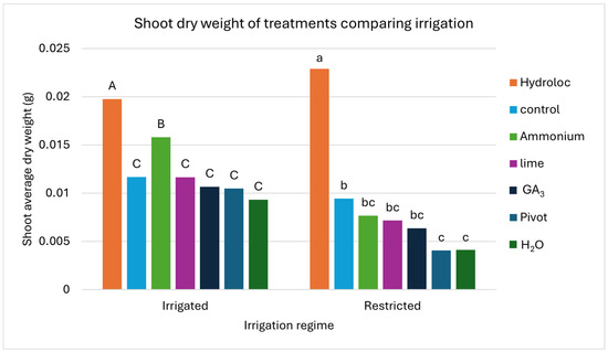 The shoot dry weight of each treatment comparing irrigation regime. The shoot dry weight in grams of the emerged seedlings after 21 days (Y-axis) and the irrigation regime (X-axis) are presented. The treatments applied are represented by different colored bars. The letters above each bar compare the LSMEANS for each treatment within an irrigation regime. Capital letters are used for the full irrigation regime, and non-capitalized ones are used for the restricted irrigation regime.