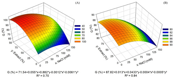 APX activity only showed an interaction between factors at 25 and 150 mM NaCl. It exhibited a quadratic effect with a maximum activity of 18.29 mmol ASA min−1 mg−1 protein at 25 mM NaCl and a minimum of 10.66 mmol ASA min−1 mg−1 protein at 150 mM NaCl, both at 51.5% extract. This enzyme was not influenced by other salt concentrations (Figure 5C,D).