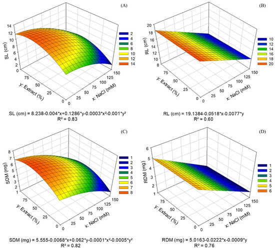 The study followed a completely randomized design with a 4 × 4 factorial arrangement (4 extract conditions × 4 salt concentrations) and three replicates per treatment. Data were analyzed using multiple regression, and the response surfaces were adjusted according to the extract and NaCl concentrations. For data that did not conform to the response surface model, polynomial regression analysis was performed for the conditioning factors, such as salinity, at a 5% probability. All statistical analyses were conducted using SigmaPlot 12.5 software.