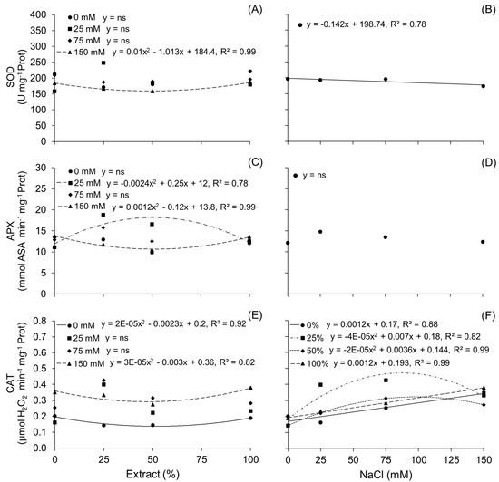 Catalase activity was strongly influenced by the NaCl concentration under all conditions. It exhibited a linear increase due to salinity in treatments with 0% and 100% extract, at a rate of 0.0012 μmol H2O2 min−1 mg−1 protein per unit of mM NaCl added to the germination medium (Figure 5F). Treatment with 25% and 50% extract followed a quadratic negative model, with maximum activity points at 87.5 mM and 90 mM NaCl, respectively. CAT activity was also demonstrated in the average test, where a significant increase was observed at 100% extract concentration at 75 and 150 mM NaCl. The variations were subtle when comparing the different extract concentrations with lower levels of saline stress (Table 3).