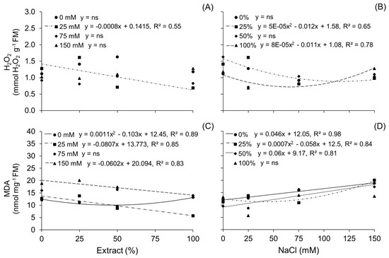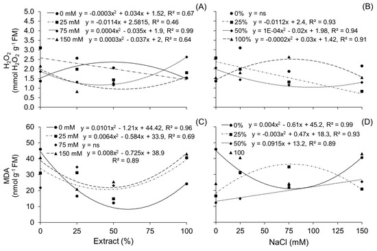 There was no interaction between factors at 75 mM NaCl in the lipid peroxidation (MDA) of cv. BRS Querência. Other salt concentrations exhibited a quadratic positive response with minimum MDA values of 8.24 nmol mg−1 FM under 60% extract, 20.54 nmol mg−1 FM under 45.6% extract, and 21.8 nmol mg−1 FM under 47% extract due to water addition at 25 mM and 150 mM NaCl, respectively (Figure 6C). Treatment with 50% extract showed an increase of 0.0915 mmol H2O2 g−1 FM per mM NaCl due to salinity. Treatment with 0% carrot extract recorded the lowest MDA content at 76 mM NaCl, which was also observed in the 50% extract treatment at the same concentration. Treatment with 25% extract reached the maximum MDA level at 78 mM NaCl (Figure 6D).