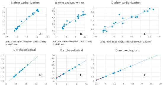 Dimensional changes in Phoenix canariensis seeds due to carbonization and reconstruction of original archaeological seed dimensions. (A–C) Linear regression models showing the relationship between pre- and post-carbonization measurements for experimentally charred seeds, where L = length, B = breadth, D = depth. Regression equation: y = β1 + β2x + ϵ, and σ = standard error. (D–F) Application of regression models to estimate original dimensions of archaeological seeds. In all plots, x and y axes show dimensions in millimeters. (A–C): x = dimensions of desiccated seeds before carbonization, y = dimensions after carbonization. (D–F): x = reconstructed original dimensions, y = measured dimensions of archaeological seeds. Red lines indicate values falling below the experimental model predictions.