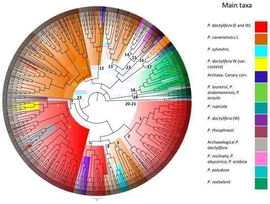 The taxonomic complexity within the Phoenix genus is further substantiated by documented instances of interspecific hybridization and genetic introgression, particularly exemplified by infraspecific variants such as P. canariensis var. porphyrococca. The occurrence of spontaneous hybridization events between P. canariensis and P. dactylifera has resulted in complex patterns of genetic admixture, manifesting in intermediate morphological characteristics and altered physiological traits. This genetic permeability between closely related Phoenix species presents significant challenges for taxonomic delimitation and phylogenetic reconstruction. The documented introgression patterns suggest historical and contemporary gene flow events, potentially influenced by both natural processes and anthropogenic factors, including cultivation practices. These hybridization dynamics not only contribute to the species’ phenotypic plasticity but also raise important questions regarding species boundaries and evolutionary trajectories within the genus [14,20,21]. Such genetic complexity necessitates a nuanced approach to taxonomic classification that acknowledges the fluid nature of species boundaries in actively evolving plant lineages.