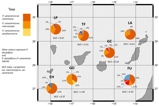 - González-Pérez, M.; Caujapé-Castells, J.; Sosa, P.A. Molecular evidence of hybridisation between the endemic Phoenix canariensis and the widespread P. dactylifera with Random Amplified Polymorphic DNA (RAPD) markers. Plant Syst. Evol. 2004, 247, 165–175. [Google Scholar] [CrossRef]