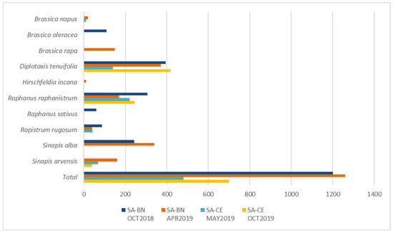 - Ten different species of Brassicaceae were identified within the transects, including Brassica napus L., Brassica oleracea L., Brassica rapa L., Diplotaxis tenuifolia L. DC., Hirschfeldia incana L. Lagr.-Foss., Raphanus raphanistrum L. (wild), Raphanus sativus (domesticated), Rapistrum rugosum L. Arcang., Sinapis alba L., and Sinapis arvensis L.