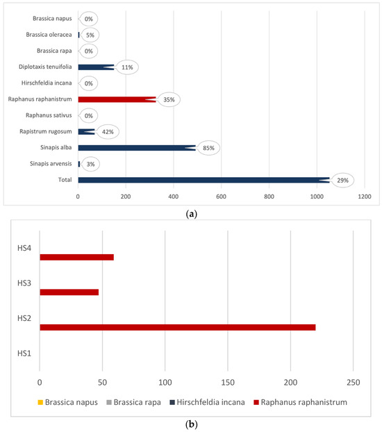 As shown in Figure 4, wild radish is present near the three seed companies (HS2, HS3, HS4). A special note should be made regarding the hot spot at the port of Salerno (HS1): only a few individuals of a few species were found inside and near the port, likely due to the fact that it is subject to plant health treatments and that the immediate surroundings are highly urbanized (there are only some flower beds present).