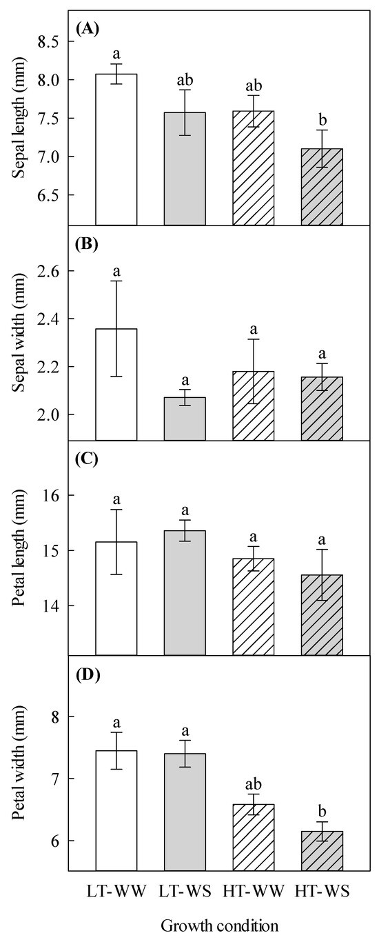Effects of temperature and watering regime on flower characteristics of canola (Brassica napus). Plants were grown under lower (LT, 20 °C/10 °C) or higher (HT, 24 °C/14 °C) temperature regime, and either well-watered (WW, watered to field capacity) or water-stressed (WS, watered at wilting point) in controlled-environment growth chambers. Sepal length, sepal width, petal length, and petal width were measured about 65 days after one week of initial growth under controlled conditions (20/10 °C, 16 h light/8 h dark). (A) sepal length, (B) sepal width, (C) petal length, and (D) petal width. Data are means ± SEM (n = 9, from three trials). Bars surmounted by different letters within each panel are significantly different based on Fisher’s LSD test (p < 0.05).