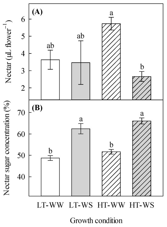 Effects of temperature and watering regime on nectar properties of canola (Brassica napus). Plants were grown under lower (LT, 20 °C/10 °C) or higher (HT, 24 °C/14 °C) temperature regime, and either well-watered (WW, watered to field capacity) or water-stressed (WS, watered at wilting point) in controlled-environment growth chambers. Nectar sugar concentration and nectar volume per flower were measured about 65 days after one week of initial growth under controlled conditions (20/10 °C, 16 h light/8 h dark). (A) nectar volume per flower, and (B) nectar sugar concentration. Data are means ± SEM (n = 9, from three trials). Bars surmounted by different letters within each panel are significantly different based on Fisher’s LSD test (p < 0.05).