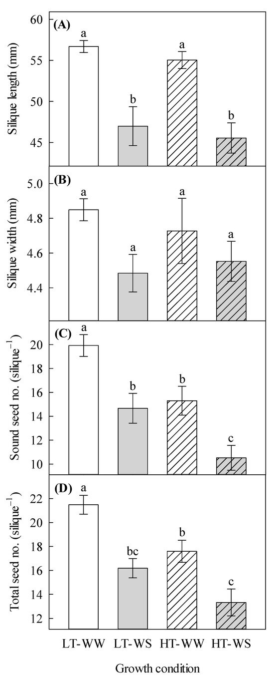 Effects of temperature and watering regime on silique and seed traits of canola (Brassica napus). Plants were grown under lower (LT, 20 °C/10 °C) or higher (HT, 24 °C/14 °C) temperature regime, and either well-watered (WW, watered to field capacity) or water-stressed (WS, watered at wilting point) in controlled-environment growth chambers. Mature siliques and seeds were harvested from plants that were grown under higher and lower temperature regimes for about 65 days, after one week of initial growth under control conditions (20/10 °C, 16 h light/8 h dark). Silique length, silique width, sound seed number per silique and total seed number per silique were measured. (A) silique length, (B) silique width, (C) sound seed number per silique, and (D) total seed number per silique. Data are means ± SEM (n = 27, from three trials). Bars surmounted by different letters within each panel are significantly different based on Fisher’s LSD test (p < 0.05).