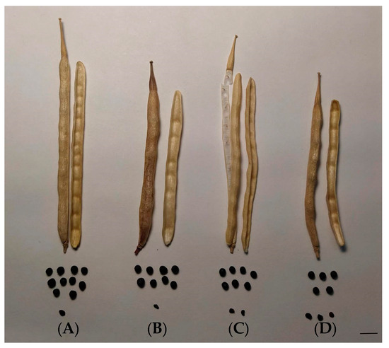 Effects of temperature and watering regime on siliques and seeds of canola (Brassica napus). Plants were grown under lower (LT, 20 °C/10 °C) or higher (HT, 24 °C/14 °C) temperature regime, and either well-watered (WW, watered to field capacity) or water-stressed (WS, watered at wilting point) in controlled-environment growth chambers. Mature siliques and seeds (siliques, upper; sound seeds, middle; and aborted seeds, lower) were harvested from plants that were grown under lower and higher temperature regimes for about 90 days, after one week of initial growth under control conditions (20/10 °C, 16 h light/8 h dark), and their characteristics were measured. (A) LT-WW, (B) LT-WS, (C) HT-WW, and (D) HT-WS. Scale bar = 5 mm.
