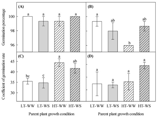 Effects of temperature and watering regime during seed development on the subsequent germination pattern of canola (Brassica napus). Plants were grown under lower (LT, 20 °C/10 °C) or higher (HT, 24 °C/14 °C) temperature regime, and either well-watered (WW, watered to field capacity) or water-stressed (WS, watered at wilting point) in controlled-environment growth chambers for about 90 days, after one week of initial growth under control conditions (20/10 °C, 16 h light/8 h dark). Mature seeds were harvested, and germination percentage (total germination) and germination speed (coefficient of germination rate) of sound seeds were determined. (A) germination percentage (total germination) of seeds under lower temperatures, (B) germination percentage of seeds under higher temperatures, (C) coefficient of germination rate (germination speed) of seeds under lower temperatures, and (D) coefficient of germination rate of seeds under higher temperatures. Data are means ± SEM (n = 9, from three trials). Bars surmounted by different letters within each panel are significantly different based on Fisher’s LSD test (p < 0.05).