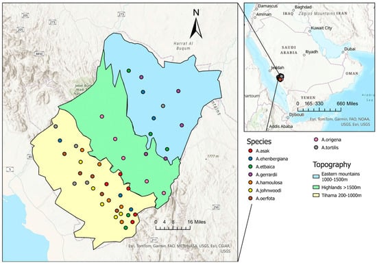 The small map shows the location of the Al-Baha region, Saudi Arabia. The large map shows the locations of Acacia trees from which samples were collected. Each colored dot represents a sampled tree. The colors indicate topographic zones: cyan corresponds to the east of the highlands, green to the highlands, and yellow to the Tihama lowlands.