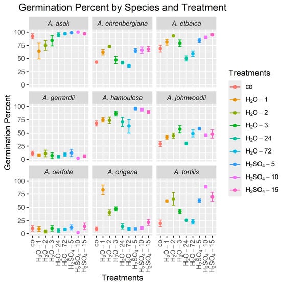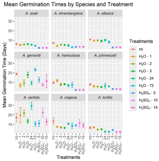 Sulfuric acid treatments exhibited the highest efficacy in accelerating the germination of six out of the nine species studied, although the amount of treatment time required varied among species (Table 3, Figure 2). Specifically, soaking the seeds in sulfuric acid for 5 min (H2SO4-5) was found to be the most effective for decreasing the MGT in A. etbaica to a mean (±standard deviation) over the four replicates of 2.36 ± 0.17 days, compared to a mean of 10.75 ± 0.93 days for the control, and in A. asak to 2.00 ± 0.00 days compared to 6.15 ± 1.17 days for the control. Soaking in sulfuric acid for 10 min (H2SO4-10) was the most effective for decreasing the MGT in A. tortilis to 2.14 ± 0.08 days compared to 6.41 ± 2.44 days for the control. Significant improvements in the MGT for A. hamoulosa were observed following both the 10 min (H2SO4-10) and 15 min (H2SO4-15) treatments, with the MGT reduced to 2.01 ± 0.02 days compared to 9.60 ± 1.88 days for the control. Soaking the seeds in sulfuric acid for 15 min (H2SO4-15) was also the most effective treatment in inducing rapid germination in A. johnwoodii, reducing the MGT to 2.77 ± 0.56 days compared to 7.78 ± 1.89 days for the control. Interestingly, the most effective treatment for A. ehrenbergiana was soaking in tap water for 72 h (H2O-72), resulting in an MGT of 2.68 ± 0.21 days compared to 7.18 ± 1.17 days for the control. There were no significant treatment effects on the MGT for A. gerrardii, A. oerfota, and A. origena.