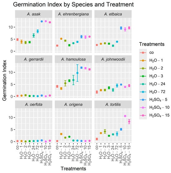 Sulfuric acid treatments led to a higher success in germination indicators in general than no treatments in most species studied (Table 5, Figure 4). Seeds were effectively treated by soaking in sulfuric acid for 5 min (H2SO4-5) to produce the highest GI for A. hamoulosa at a mean (±standard deviation) over the four replicates of 11.91 ± 0.67, compared to a mean of 4.17 ± 0.90 for the control, and A. johnwoodii at 4.92 ± 0.16, compared to 1.82 ± 1.08 for the control. Additionally, soaking in sulfuric acid for 10 min (H2SO4-10) significantly improved the GI of A. tortilis to 10.60 ± 0.60 compared to 1.06 ± 0.78 for the control and A. asak to 12.46 ± 0.08 compared to 4.85 ± 0.83 for the control. The results demonstrated that 15 min of soaking in sulfuric acid (H2SO4-15) successfully improved the GI in A. ehrenbergiana to 6.05 ± 0.40, compared to 2.34 ± 0.56 for the control, and A. etbaica to 9.68 ± 0.95, compared to 2.60 ± 0.20 for the control. However, soaking the seeds in hot water for a minute (H2O-1) rather than in sulfuric acid increased the germination index of A. origena to 3.14 ± 0.60, compared to 0.22 ± 0.17 for the control. There were no significant treatment effects on the GI for A. gerrardii and A. oerfota.