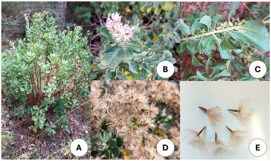 General appearance of Garberia heterophylla including its (A) growth habit; (B) inflorescence; (C) leaf arrangement; (D) infructescence; and (E) cypselae.