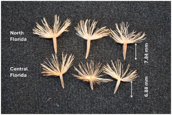 Ten representative seeds from each population (Central and North Florida) were measured using a digital caliper and photographed. Next, a subsample of seeds from each population was sent to an independent seed testing facility to assess initial pre-germination seed viability and embryo fill (US Forest Service National Seed Laboratory, Dry Branch, GA, USA). First, seeds were non-destructively imaged using an UltraFocus X-ray system equipped with the Vision software (Faxitron® Bioptics, LLC, Tucson, AZ, USA) to determine embryo development. Then, two replicates of 100 seeds per population were cut laterally, removing the distal end of the cotyledons, and stained overnight at 37 °C in a 1.0% TZ (2,3,5-triphenyl-2H-tetrazolium chloride) solution in accordance with the Association of Official Seeds Analysts (AOSA) rules for TZ testing of Asteraceae [25]. Seeds were considered viable when firm embryos stained evenly red under 10× magnification.