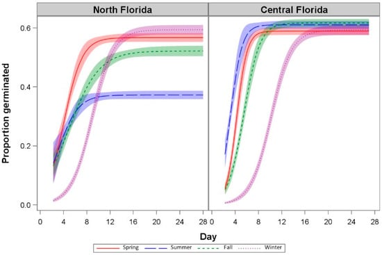 The greatest final germination of seeds collected from Central Florida occurred in the winter temperature (59.5%), followed by spring (56.5%), fall (52.0%), and then summer (37.5%). For seeds collected from North Florida, the greatest final germination occurred in the summer and fall temperatures (61.0–61.5%) compared to the winter and spring temperatures (59.5–59.0%) (Figure 4). Overall, seeds collected in North Florida had a more consistent germination proportion across the temperature treatments (Figure 3 and Figure 4).