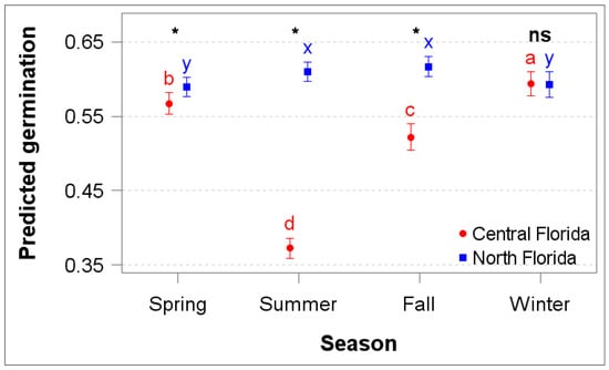 Final germination proportion after 28 days for garberia as predicted by a logistic growth model for seed collected in Central Florida (red) and North Florida (blue) across four temperatures: 19/29 °C (spring); 24/33 °C (summer); 15/27 °C (fall); and 11/22 °C (winter). The colored letters indicate statistically meaningful differences between seasons within a location (α = 0.05). The * symbol indicates statistically meaningful differences between locations within a season (α = 0.05); ns = nonsignificant.