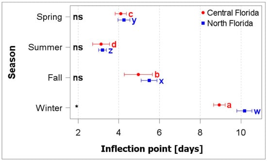 Germination speed for garberia seed collected in Central Florida (red) and North Florida (blue) across four temperatures: 19/29 °C (spring); 24/33 °C (summer); 15/27 °C (fall); and 11/22 °C (winter). The inflection point in this logistic growth model represents the days to half-maximum germination. Means ± 95% confidence intervals are presented. Within each population, the different letters indicate statistically meaningful differences between seasons (α = 0.05). Within each season, the * symbol indicates statistically meaningful differences between locations (α = 0.05); ns = nonsignificant.