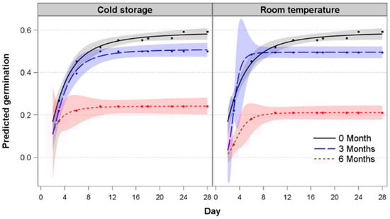A significant effect for each storage duration (3 and 6 months) was observed for the germination of seeds maintained in cold and room temperature storage conditions (Figure 6 and Figure 7). After 3 months of cold storage, predicted germination decreased by 15.6% when compared to the predicted germination of non-stored seeds. After an additional 3 months of cold storage (6 months total storage), predicted germination decreased even more dramatically by 52.0% when compared to 3 months of storage and 59.5% when compared to 0 months (non-stored seed). Likewise, a similar trend was observed for seeds stored at room temperature (Figure 7), with significant responses observed between 0-, 3-, and 6-month intervals displayed by a 16.0% reduction in predicted germination between 0 and 3 months of storage, a 57.6% reduction in predicted germination between 3 and 6 months, and a 64.6% reduction in predicted germination between 0 and 6 months.