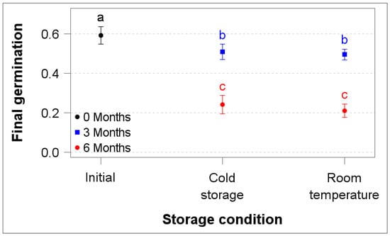 Final germination proportion of garberia as predicted by a logistic growth model for seed (Central Florida population) stored at room temperature (25.5 ± 2 °C) or in refrigerated conditions (4.0 ± 0.5 °C) for 0-, 3-, and 6-month intervals. Seeds germinated in the spring incubator (19/29 °C) for 28 days. The colored letters indicate statistically meaningful differences between storage durations (α = 0.05).