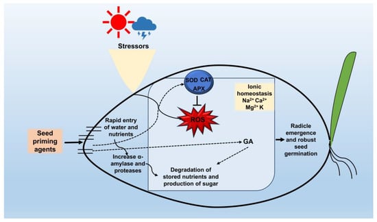 Mechanisms by which seed priming agents enhance seed germination and seedling growth. Seed priming agents facilitate the fast absorption of water and nutrients, hence enhancing the activities of α-amylase and proteases. Moreover, stress-induced ROS are neutralized by priming-mediated antioxidant enzymes, and priming also modulates the gibberellin (GA) levels. Collectively, these actions diminish the stored nutrients and expedite sugar generation, hence enhancing seed germination and seedling growth. Straight or dotted arrows denote stimulation, enhancement, or activation of a given process. Inhibitory (T-shaped) arrows indicate inhibition of a given process.