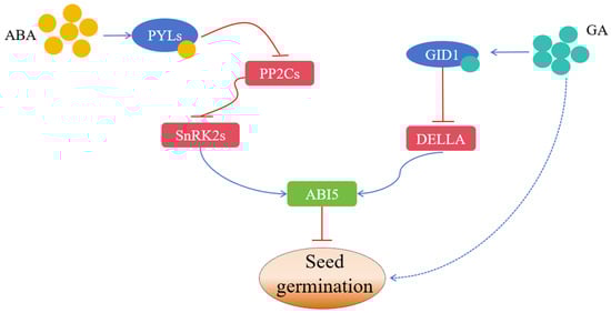 The hormone regulatory network of seed germination. The blue and red lines indicate positive and negative effects, respectively.