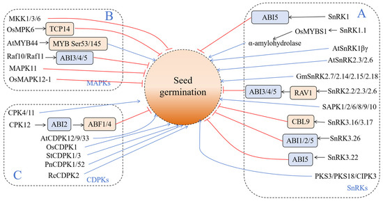 Kinases involved in seed germination. (A) Sucrose non-fermentation 1-related protein kinases (SnRKs); (B) mitogen-activated protein kinases (MAPKs); (C) calcium-dependent protein kinases (CDPKs). The blue and red lines indicate positive and negative effects, respectively.