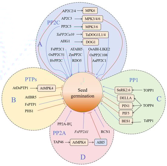 The schematic diagram of key phosphatase signal pathways regulating seed germination. This figure shows how specific phosphatases can control the transformation process of seeds from dormancy to germination by regulating the activities of downstream kinases and transcription factors. (A) Protein phosphatase 2C (PP2C); (B) protein tyrosine phosphatase (PTP); (C) protein phosphatase 1 (PP1); (D) protein phosphatase 2A (PP2A). The blue and red lines indicate positive and negative effects, respectively.